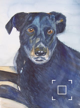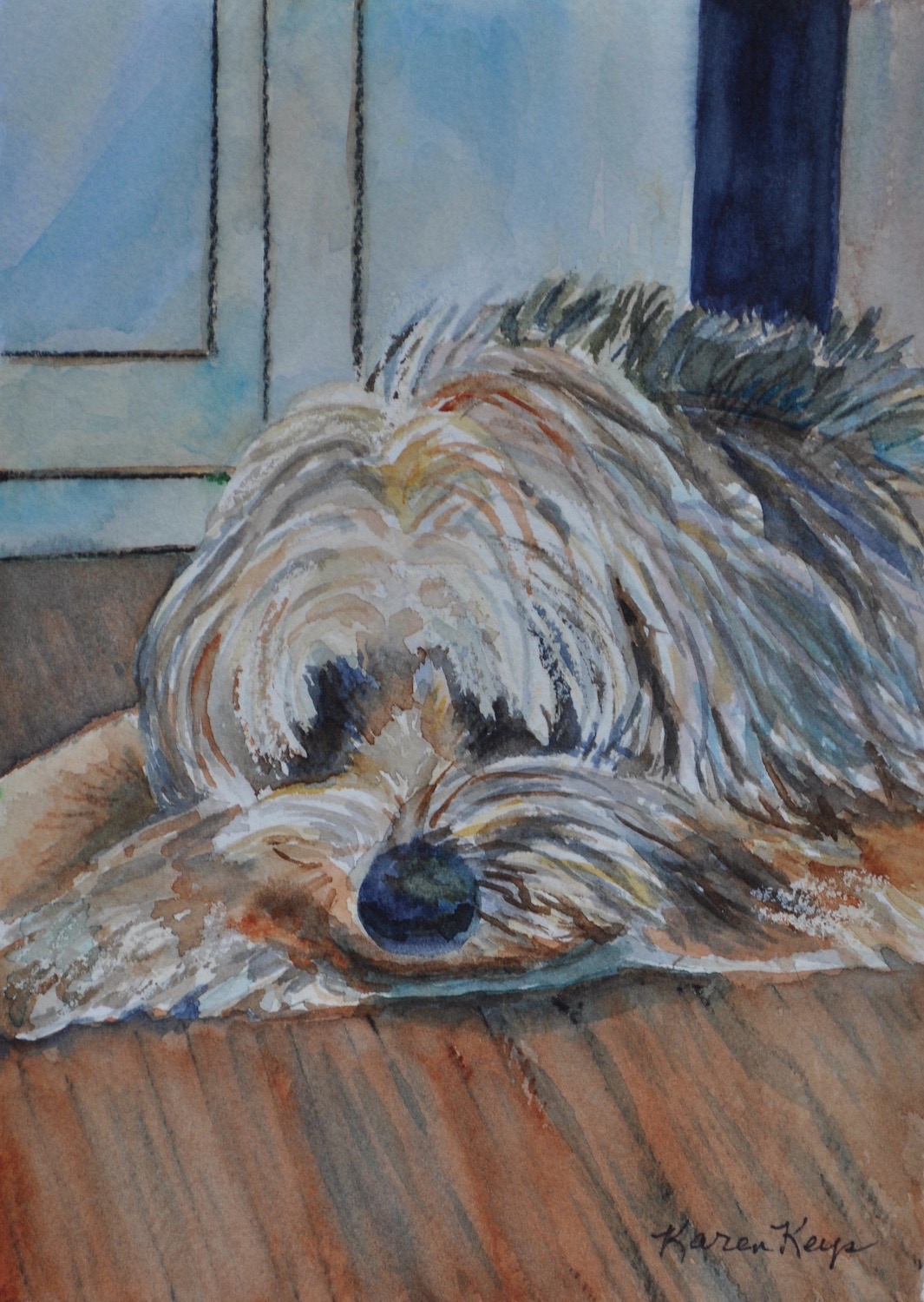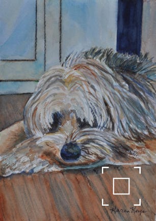 My standard commissions are painted in watercolor, 11xx14, mostly dogs and cats, (sometimes fish!), matted and protected in a glassine envelope for $150. I have also been commissioned to paint birds, horses, cows,