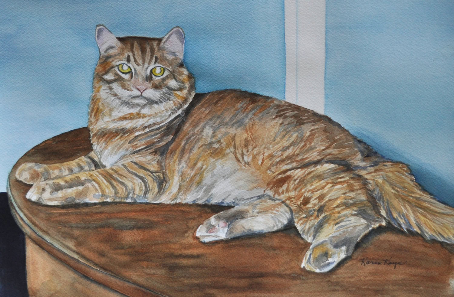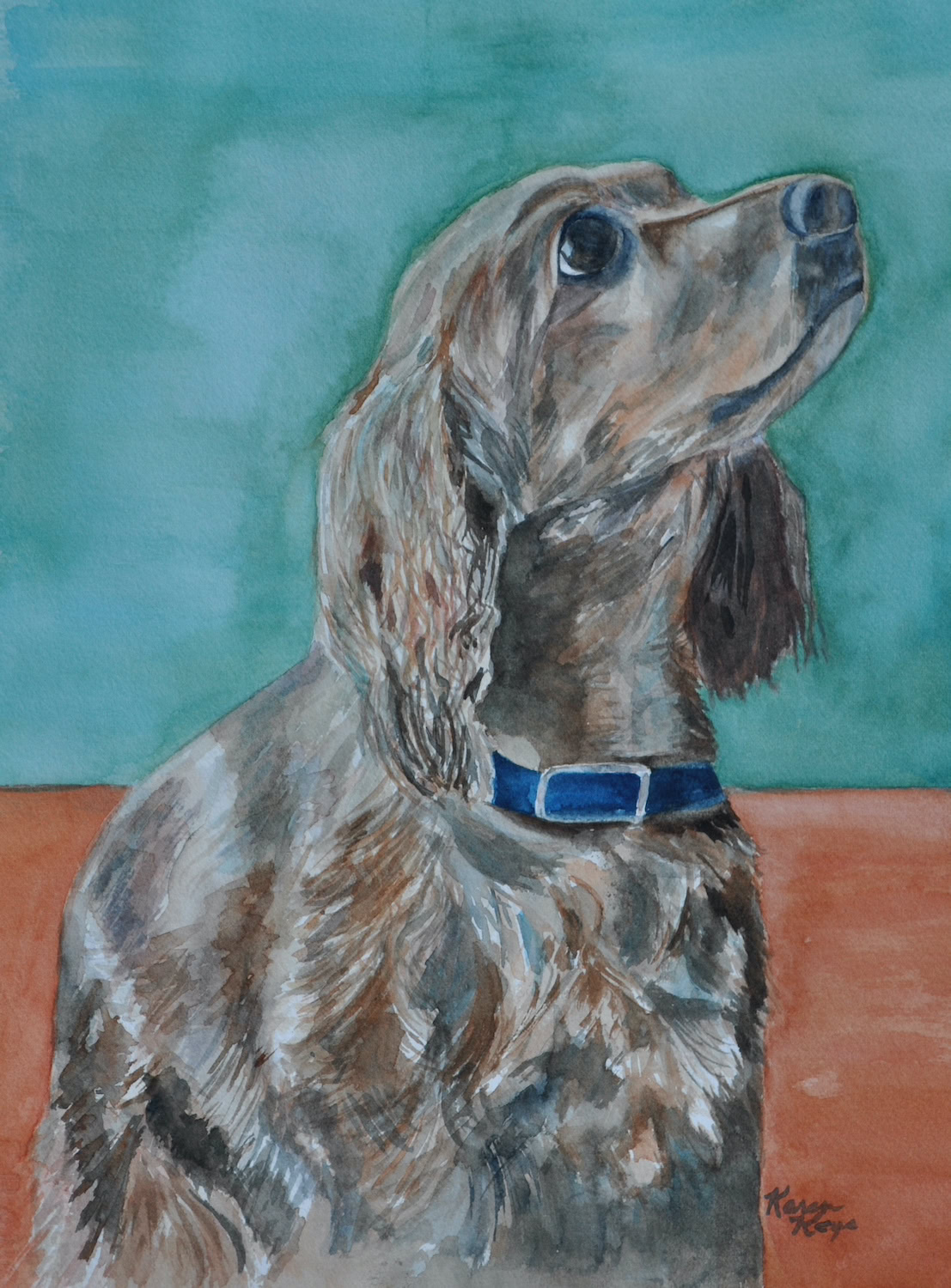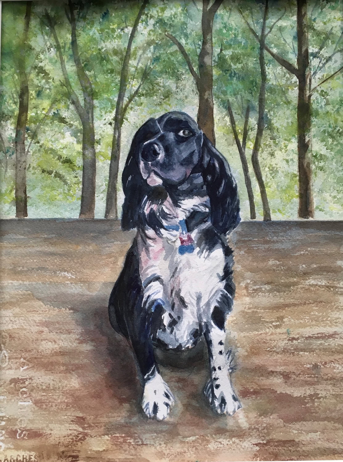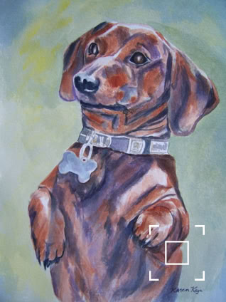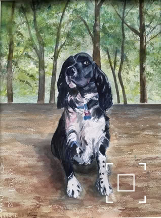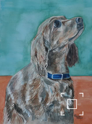 My standard commissions are painted in watercolor, 11xx14, mostly dogs and cats, (sometimes fish!), matted and protected in a glassine envelope for $150. I have also been commissioned to paint birds, horses, cows,