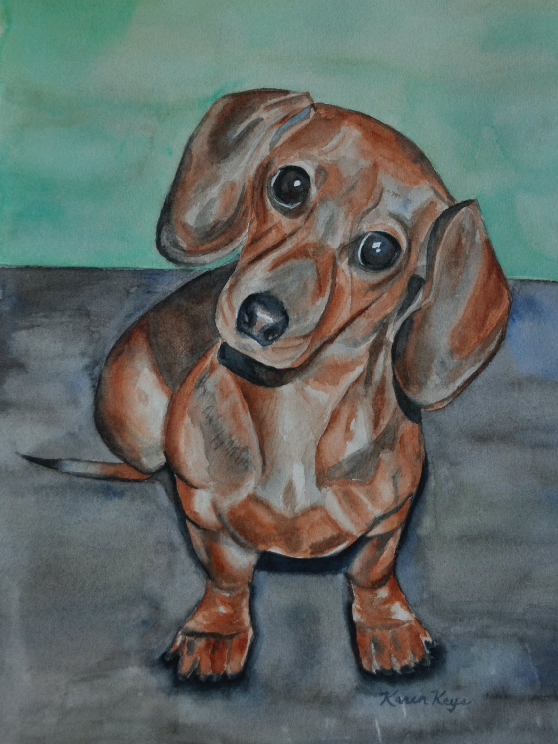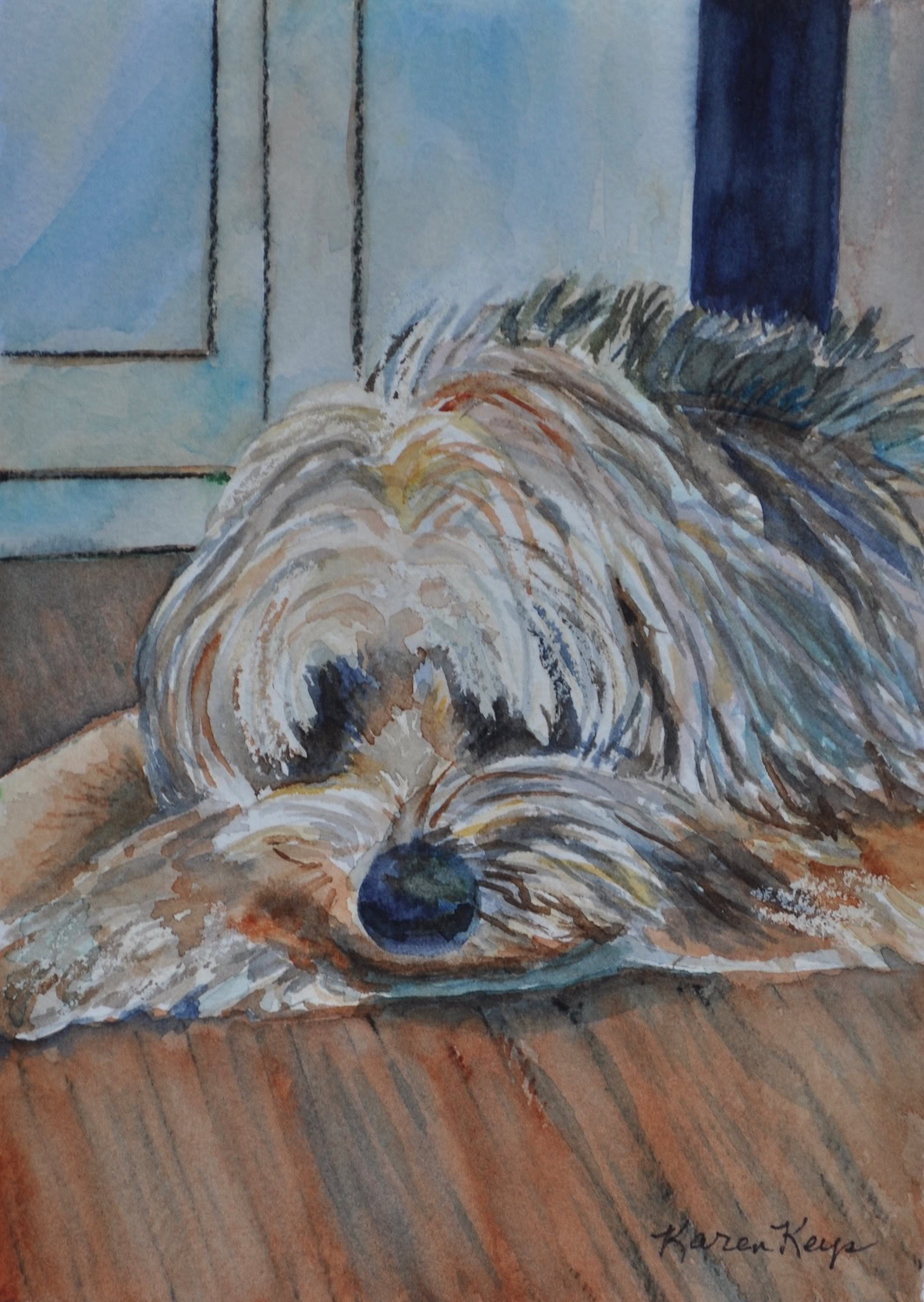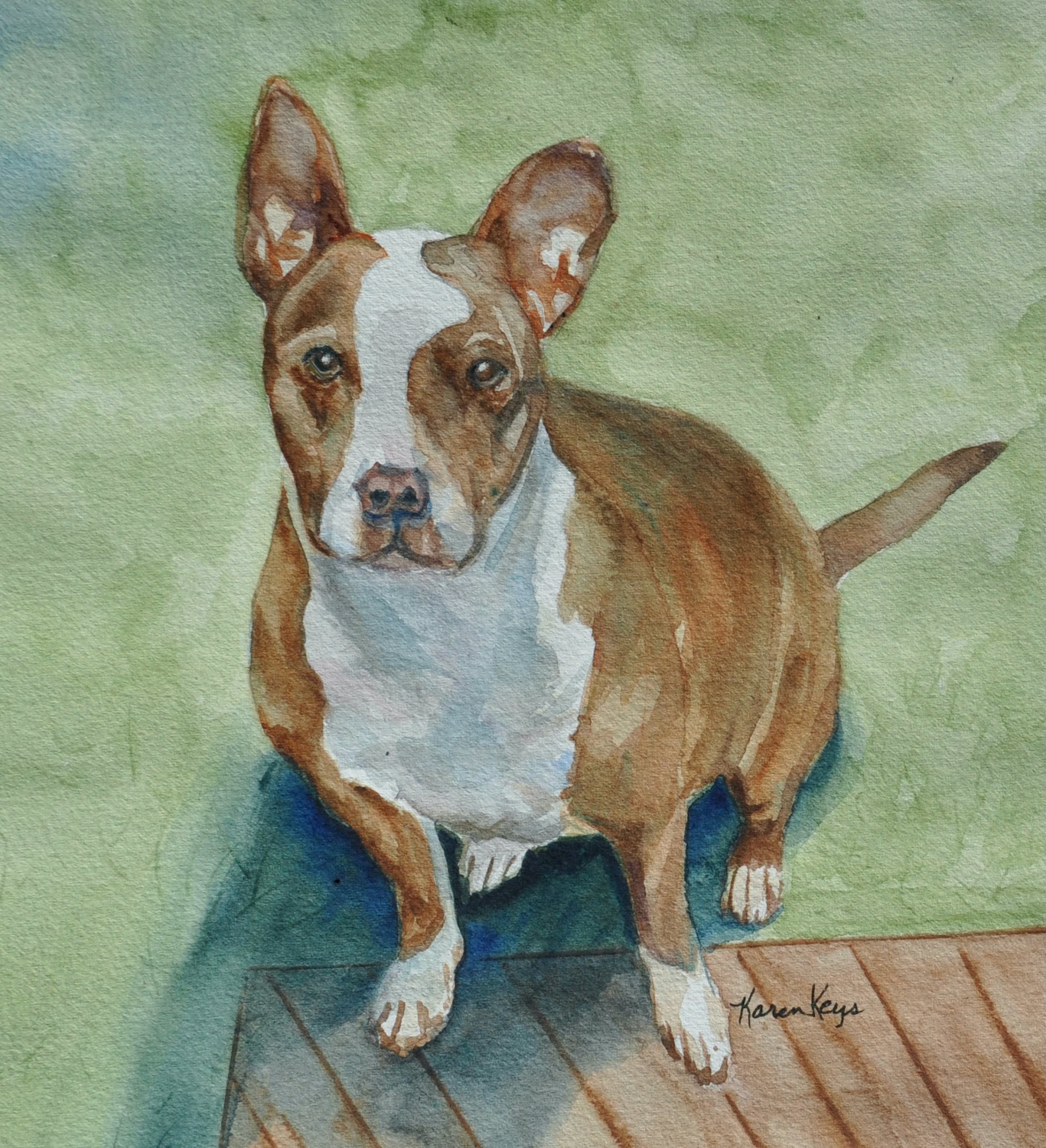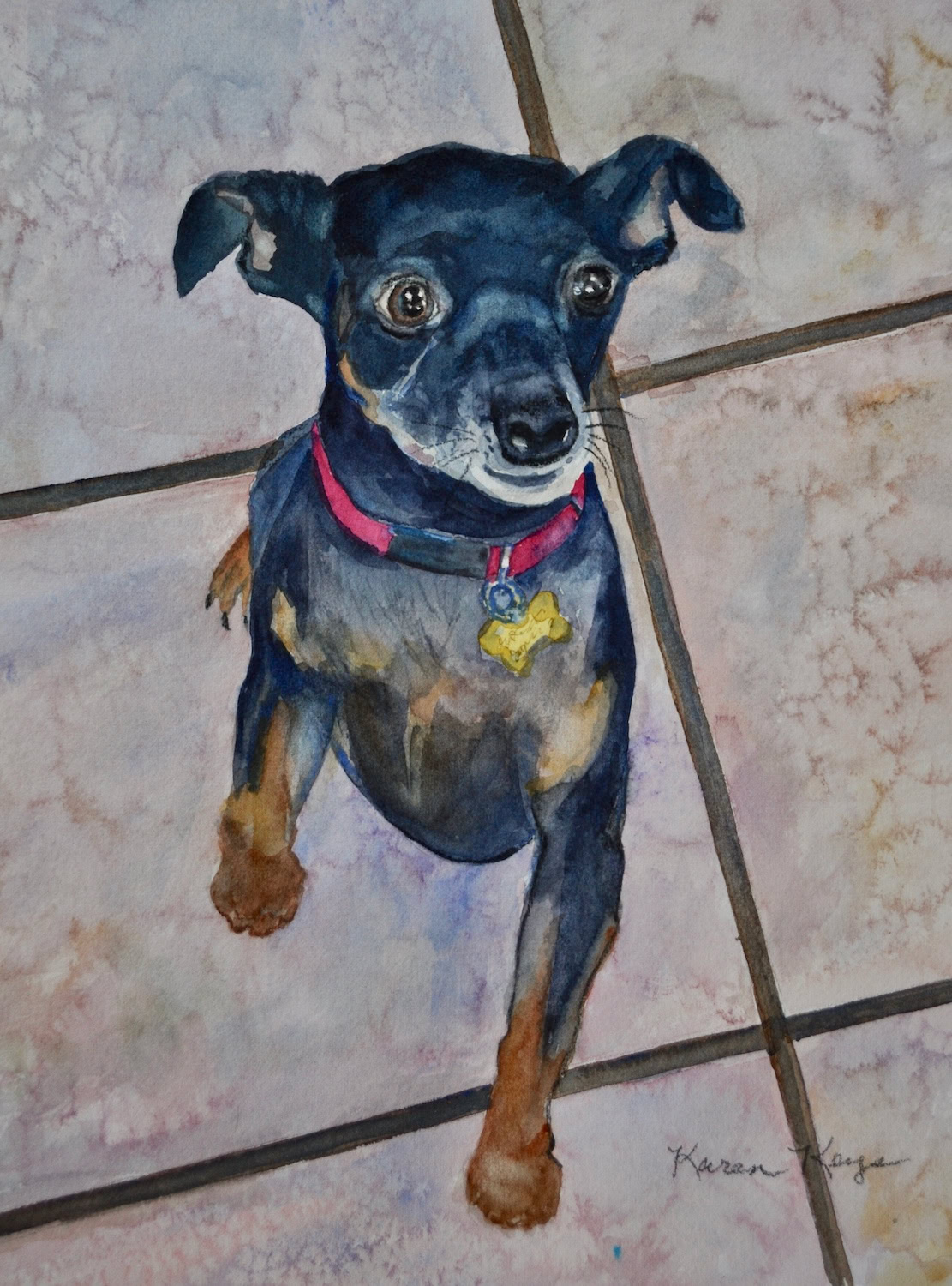 My standard commissions are painted in watercolor, 11xx14, mostly dogs and cats, (sometimes fish!), matted and protected in a glassine envelope for $150. I have also been commissioned to paint birds, horses, cows,